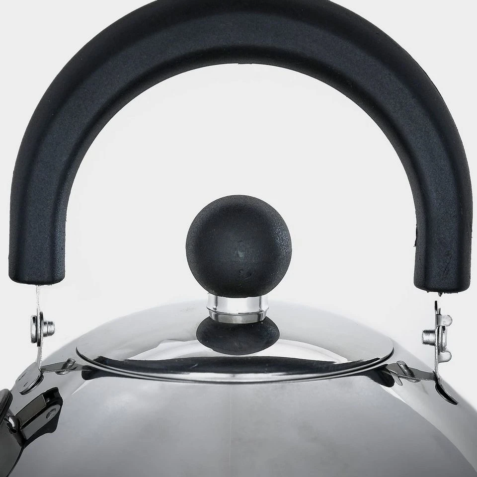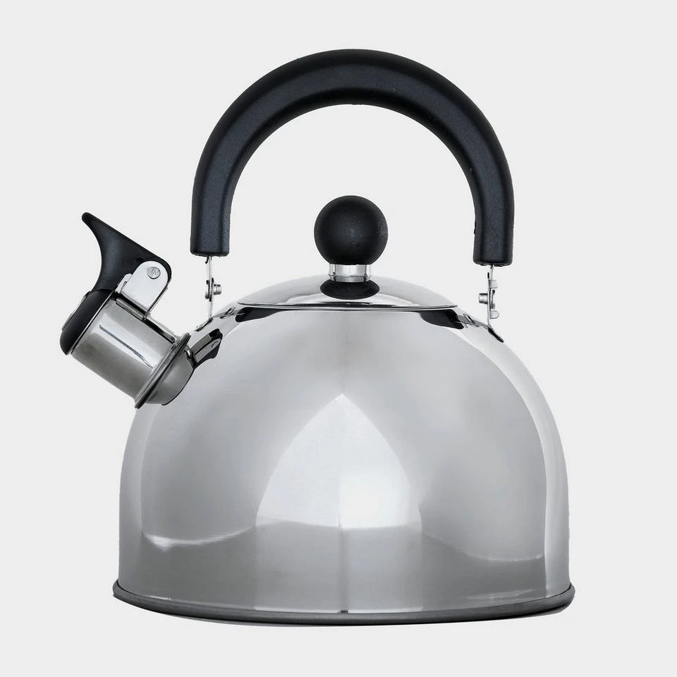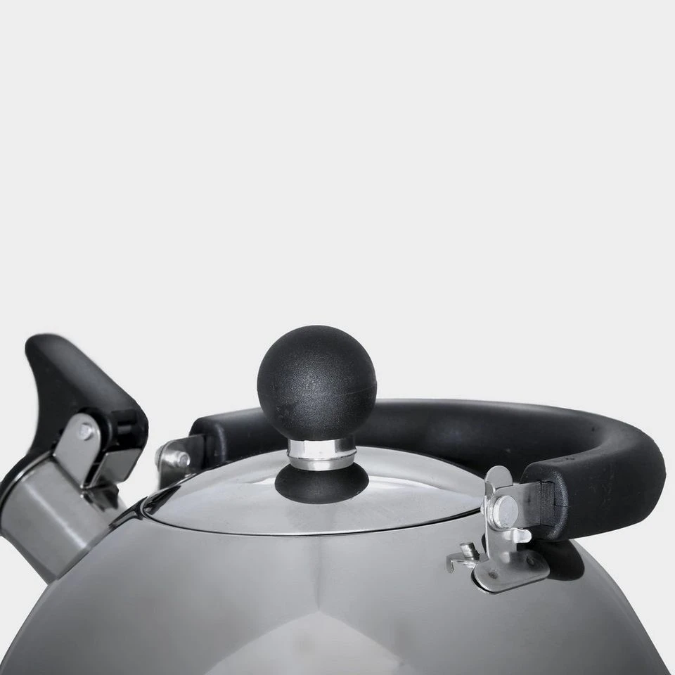 A traditional whistling kettle with a handy folding handle to save space on your camping adventures.